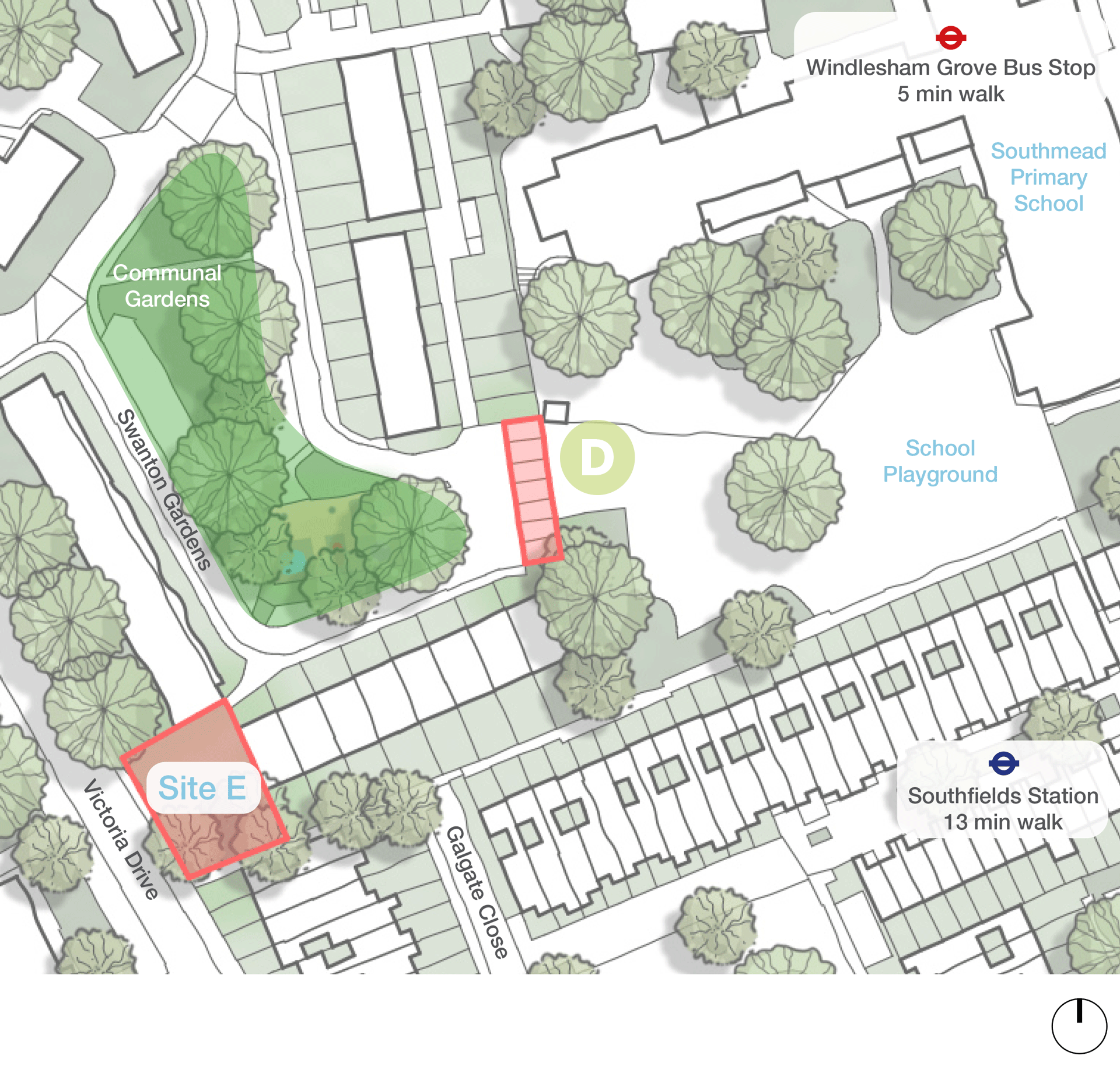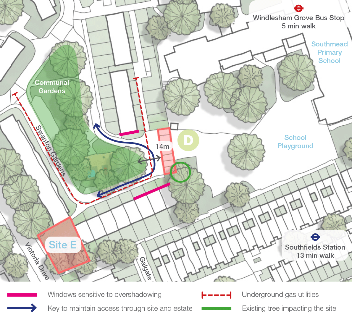 Adjacent buildings have windows facing the site that will need to be considered from an overshadowing and privacy perspective. Care must also be taken to ensure that Southmead Primary School playground to the east is not overlooked.